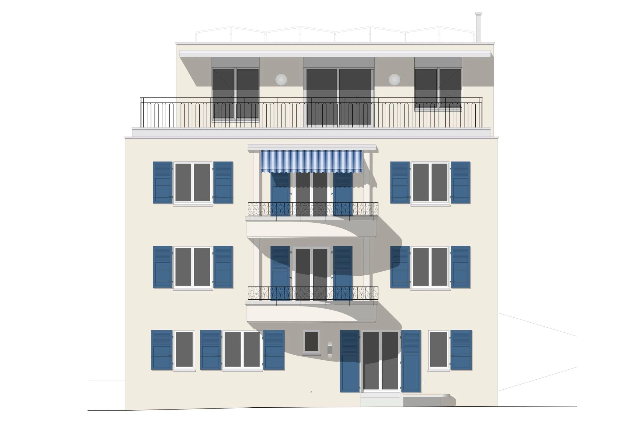 Construit en 1953, le bâtiment dʼhabitation existant, avec ses 350 m2 de façades et ses trois niveaux, nécessitait un important projet dʼassainissement. Le projet se porte sur deux thématiques : lʼisolationde lʼenveloppe existante avec la modification dʼouvertures existantes et la démolition de la toiture à deux pans pour la création dʼune surélévation en bois.